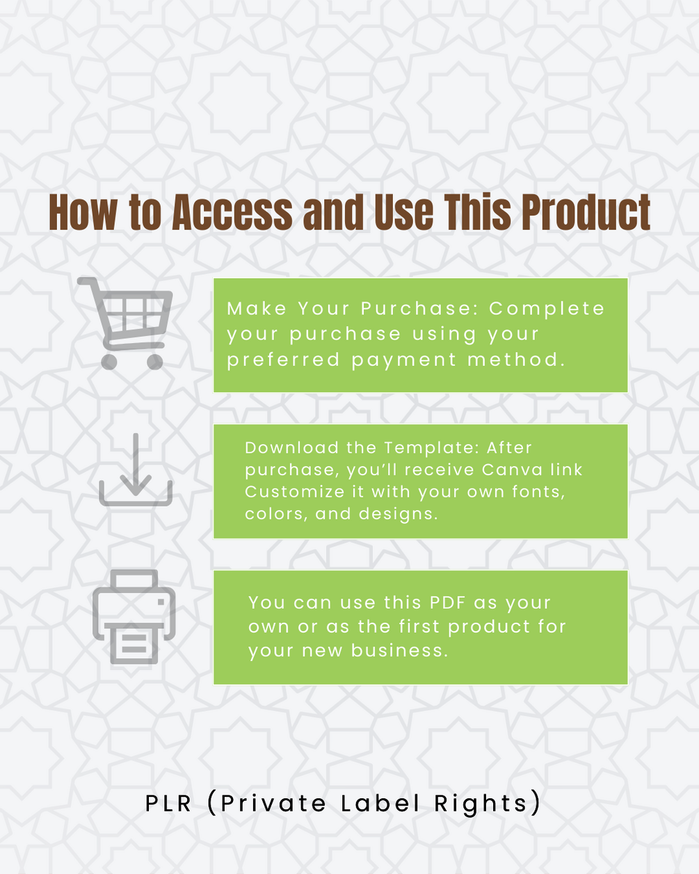 Once customized, you can resell this eBook as your own product, listing it on platforms like Gumroad, Stan Store, or your own website. Promote it through your social media or email campaigns to reach your target audience. With its universal appeal to Muslims worldwide, this product is perfect for anyone looking to build a sustainable and impactful digital business.