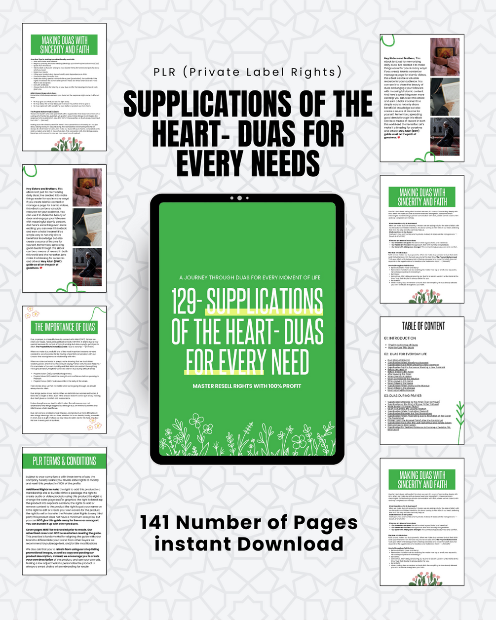 Transform your digital business today with Supplications of the Heart – Duas for Every Need! This ready-to-customize eBook offers incredible value for both personal growth and business success. Don’t miss the opportunity to resell this beautifully designed product and earn 100% profit while sharing the gift of spiritual enrichment.